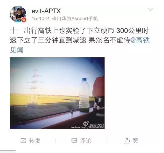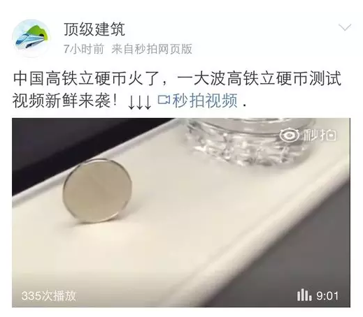 各路中國網友開始踴躍證明,用一元硬幣在高鐵上做起了立硬幣實驗(一元人民幣厚度是1.85毫米),結果硬幣依然傲然挺立,表示毫無壓力。