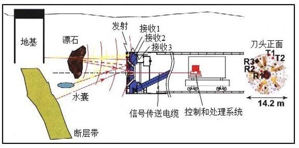 在盾構(gòu)機(jī)或TBM上安裝超前地質(zhì)預(yù)報(bào)設(shè)備,一直是機(jī)械開(kāi)挖的目標(biāo)和方向,但目前的盾構(gòu)機(jī)和TBM基本上還沒(méi)有這方面的設(shè)備。日本一些學(xué)者,做過(guò)一些SSP(Sonic Soft Ground Probing)聲波前方預(yù)報(bào)的試驗(yàn)工作(見(jiàn)下圖),但目前仍沒(méi)有更深入的研究成果和更成熟的經(jīng)驗(yàn)。