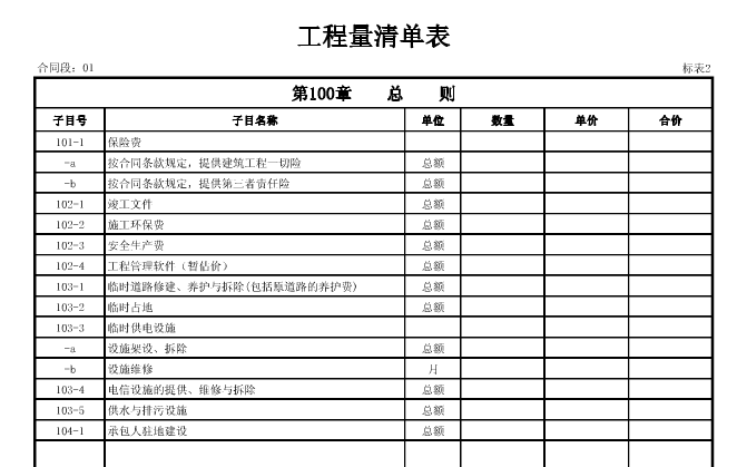 根據(jù)《公路工程標(biāo)準(zhǔn)施工招標(biāo)文件》(2009年版),清單計(jì)價(jià)規(guī)則把全部非實(shí)體工程的計(jì)價(jià)內(nèi)容全部放到第100章進(jìn)行計(jì)價(jià)。對(duì)于這部分內(nèi)容,由于目前尚缺乏相對(duì)規(guī)范統(tǒng)一和公平合理的費(fèi)項(xiàng)內(nèi)容和額度標(biāo)準(zhǔn),使具體的編制和審核欠缺可操作的依據(jù),給合理確定和有效控制造價(jià)帶來(lái)了難度,同時(shí),由于標(biāo)準(zhǔn)不一、理解不一,各地各項(xiàng)目之間以及各標(biāo)段之間招標(biāo)人的要求也各不相同,給預(yù)算編制者造成很大的困惑。本文擬就100章的編制,闡述常用的做法和技巧。