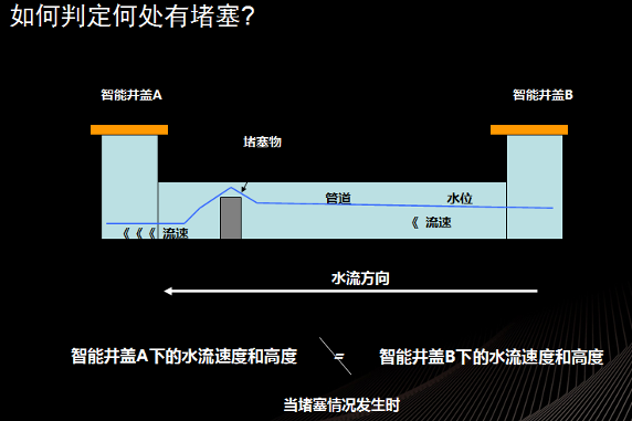 美國(guó)某城市采用了智能井蓋結(jié)合 IBM 的智慧城市平臺(tái),提前應(yīng)對(duì)強(qiáng)降雨天氣對(duì)市民的影響。該城市部署了 44 個(gè)智能井蓋,每 5 分鐘這些井蓋就往運(yùn)營(yíng)平臺(tái)發(fā)送一次數(shù)據(jù),其中包括水位、水流速和水溫。同時(shí),該系統(tǒng)還整合了氣象信息,城市管網(wǎng)拓?fù)湫畔ⅲ煌ㄐ畔⒌取O聢D說(shuō)明了分析技術(shù)如何通過(guò)智能井蓋的信息分析管道的擁堵。