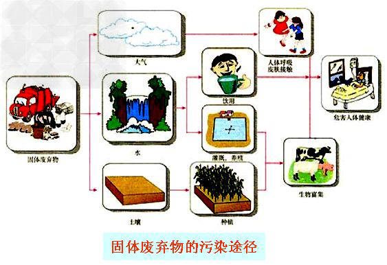 固體廢物特別是有害固體廢物能通過不同途徑危害人體健康。通常,工礦業固體廢物所含化學成分能形成化學物質型污染、人畜糞便和生活垃圾能形成病原體型污染。