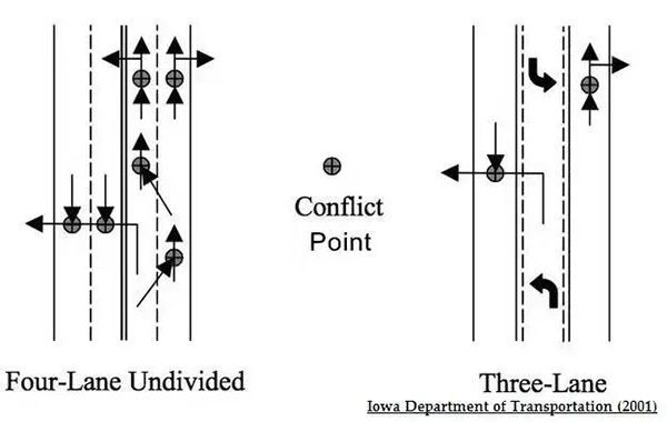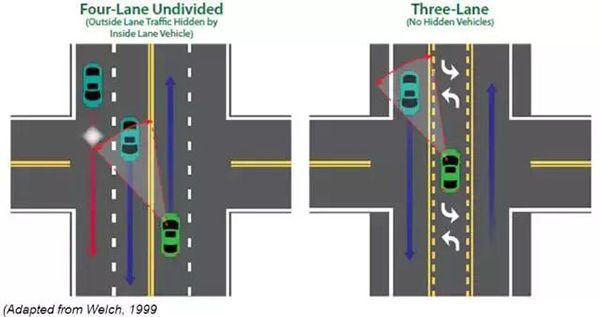 在美國,道路瘦身的形式是將傳統(tǒng)的雙向四車道改造為帶有中央左轉(zhuǎn)專用道的三車道道路,當(dāng)然還可以通過三車道改造為兩車道、自行車道改造為隔離式(受保護)的自行車專用道、減少寬街道的車道寬度等方式進行「道路瘦身」工程。