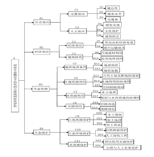 總目標層(A):綠色生態概念下的農村公路線網優化設計綜合評價。評價的總目標是:適應中國建設農村公路線網的國情,符合可持續發展的“綠色公路”理念,立足實際.基于“社會一經濟一白然”復合生態系統平衡的概念和農村公路的作用與特點,著重于“綠色生態”,作出優化設計的綜合評價。