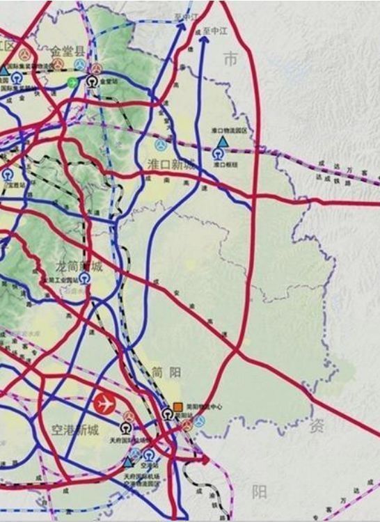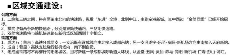 依托成巴高速、成南高速、天府國際機場高速等“六射一環”高速公路輻射區域,帶動區域協同發展。建設金簡仁快速、中金簡快速、成資快速等多條區域快速通道,帶動沿線城鄉發展。