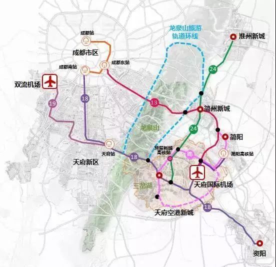 依托既有成渝鐵路、達成鐵路和規劃貨運外繞線,連接青白江國際鐵路港,融入 “ 蓉歐+ ” 。淮州新城預留國際鐵路港功能。規劃建設蓉昆高鐵成自段、成達萬高鐵等7條出川高鐵,融入國家高鐵網絡。推動成渝客專、遂成鐵路和蓉昆高鐵成自段等鐵路公交化運營,強化區域協作。依托18號線、13號線等軌道快線,實現中心城區和東部城市新區 “ 半小時 ” 到達機場。