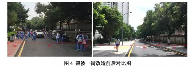 ● 碧波一街:原雙向2 車道機動車道寬度從8 米壓縮為6 米,利用兩側消極的綠化帶,將兩側人行道寬度從1 米加寬到5 米。