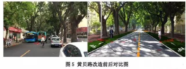● 黃貝路:原10 米機動車道壓縮為7 米,在兩側各設置1.5 米寬自行車道,解決自行車出行和地鐵接駁需要。