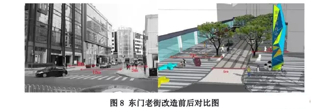 ● 東門老街:機動車道由10 米壓縮至6 米,兩側人行道分別從5 米加寬至7 米,從8米加寬至10米。