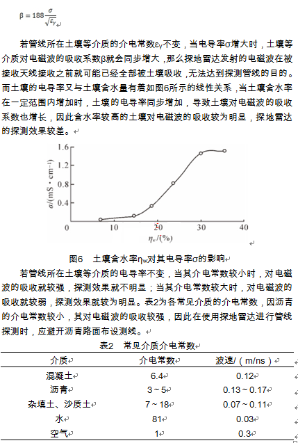 探地雷達(dá)發(fā)射高頻電磁波進(jìn)行探測時(shí),土壤等介質(zhì)的對(duì)電磁波的吸收系數(shù)β與電導(dǎo)率σ成正比,即