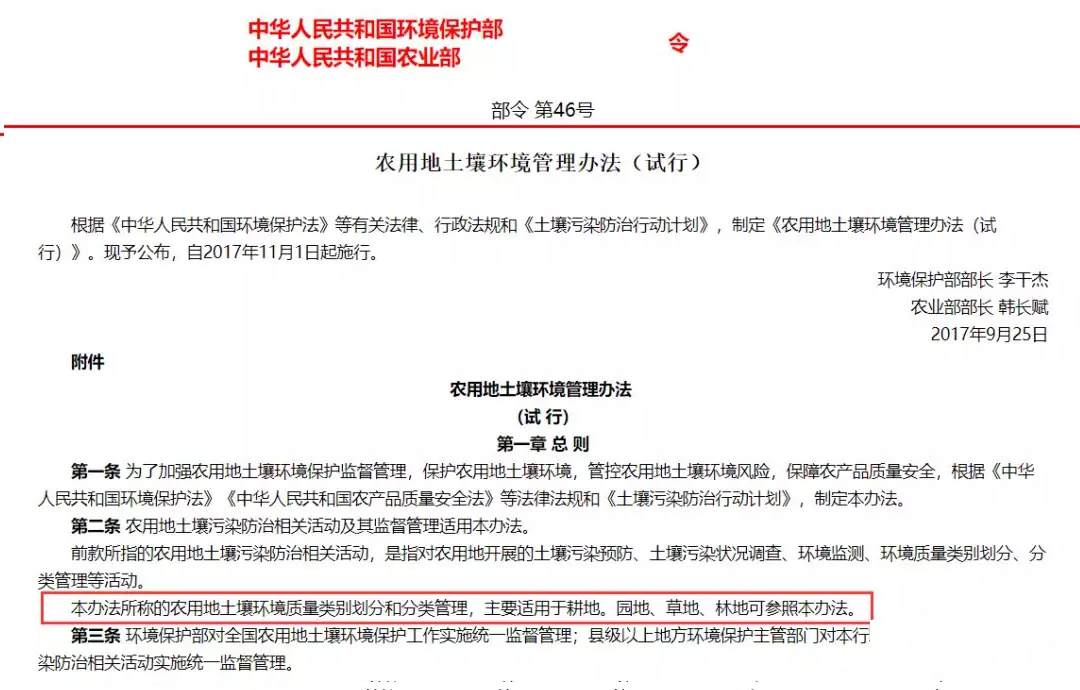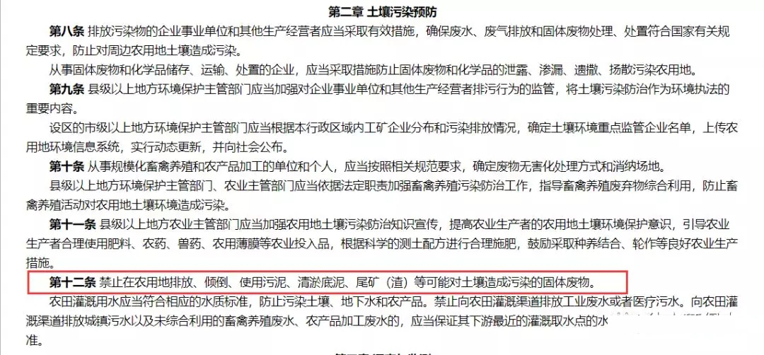 在該標準發布之前,環保部和農業部于2017年9月25日聯合發布了《農用地土壤環境管理辦法(試行)》(環境保護部、農業部令 第46號),自2017年11月1日起施行。該辦法第二條第三款規定:“本辦法所稱的農用地土壤環境質量類別劃分和分類管理,主要適用于耕地。園地、草地、林地可參照本辦法。”同時,該辦法第十二條第一款規定:“禁止在農用地排放、傾倒、使用污泥、清淤底泥、尾礦(渣)等可能對土壤造成污染的固體廢物。"看到這里小伙伴們是不是有點蒙了,一個是強制性國家標準,一個是部門規章,一個說只要滿足要求就可以用,另一個卻說禁止用。
