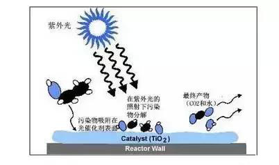 原理:光催化劑納米粒子在一定波長的光線照射下受激生產(chǎn)電子空穴對,空穴分解催化劑表面吸附的水產(chǎn)生氫氧自由基,電子使其周圍的氧還原成活性離子氧,從而具備極強(qiáng)的氧化還原能力,將光催化劑表面的各種污染物摧毀。