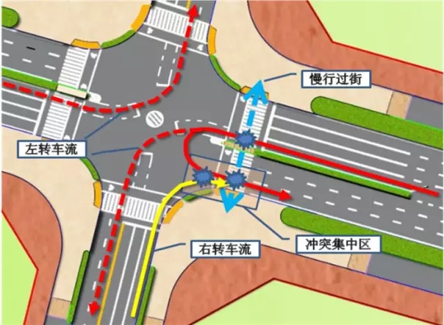 特征分析:只能在左轉(zhuǎn)相位允許時(shí)使用,占用交叉口展寬資源,易與行人過街及對(duì)向右轉(zhuǎn)車形成干擾。