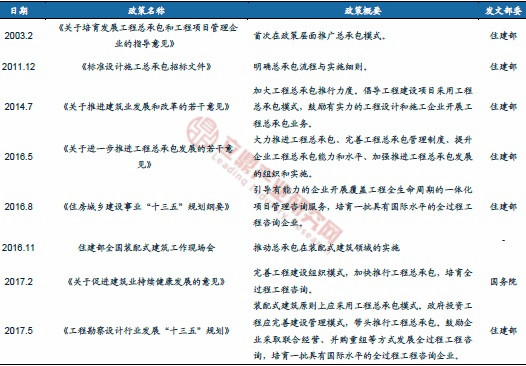 ——自2003年開始,國家陸續出臺政策推廣總承包模式,并引導裝配式建筑原則上使用總承包模式。2016年住建部發布《關于進一步推進工程總承包發展的若干意見》,《意見》強調大力推進工程總承包,提升項目可行性研究和初步設計深度,實現設計、采購、施工等各階段工作的深度融合,提高工程建設水平。