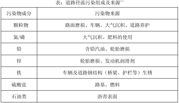 研究表明,道路徑流中污染物成分主要包括來源輪胎磨損、防凍劑使用、機(jī)械潤滑的泄漏、殺蟲劑及肥料的使用、廢物丟棄的顆粒沉積物、橡膠、金屬、油類等(見下表)。隨著城市道路和交通流量的飛速增長,路面污染物的累積量,不可避免的增加,并隨著道路雨水徑流進(jìn)入周邊水體或直接滲入地下,對我國城市水安全造成極大的威脅。