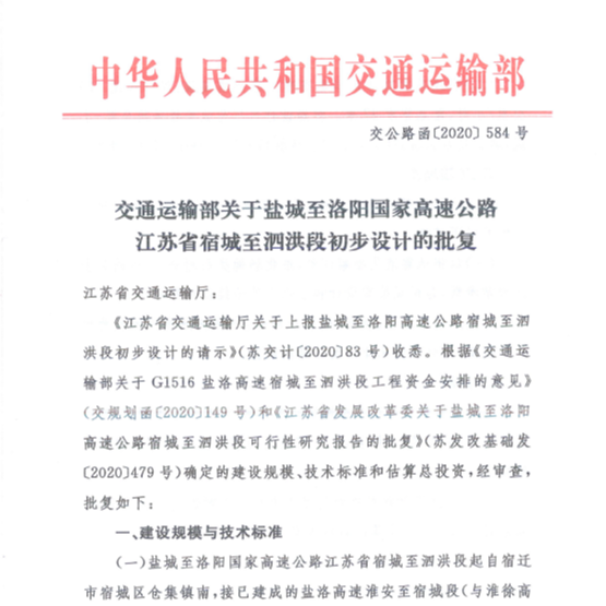 鹽洛高速公路宿城至泗洪段初步設計獲交通運輸部批復