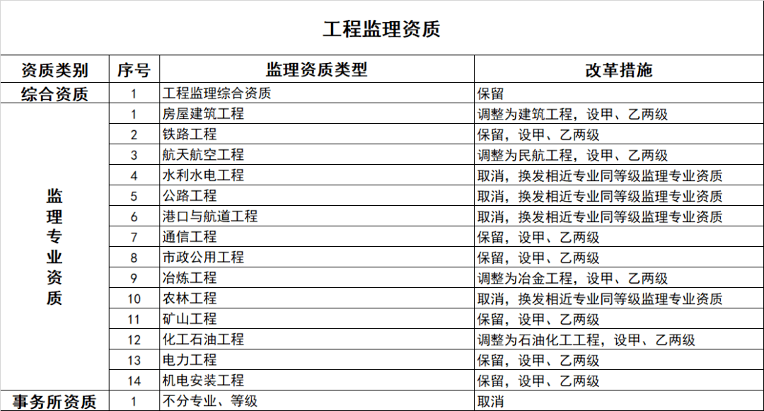 監(jiān)理專業(yè)資質(zhì)等級(jí)壓減為甲、乙兩級(jí),原丙級(jí)資質(zhì)并入相應(yīng)專業(yè)的乙級(jí)資質(zhì)。取消事務(wù)所資質(zhì)。