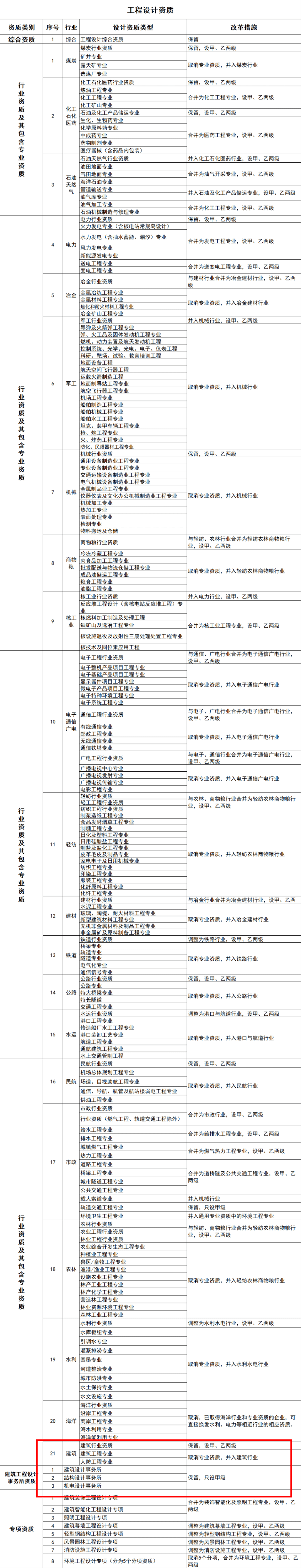 其中,冶金行業(yè)與建材行業(yè)合并為冶金建材行業(yè)資質(zhì),輕紡行業(yè)、農(nóng)林行業(yè)、商物糧行業(yè)合并為輕紡農(nóng)林商物糧行業(yè);