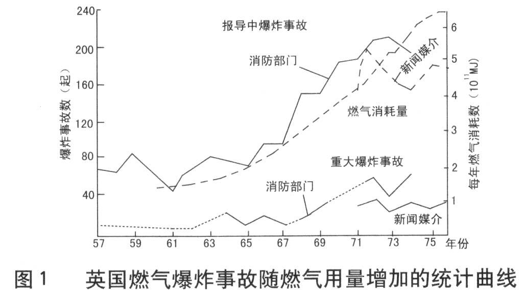 然而,隨著燃氣網絡規模的擴大和用戶群體的增加,燃氣事故也愈加頻繁,統計表明燃氣爆炸的事故數與燃氣用戶和燃氣消耗幾乎成正比,圖1為英國燃氣爆炸事故隨燃氣用量增加的統計曲線[1]。據統計,我國每年發生燃氣管線事故平均逾萬起,造成直接經濟損失上億元。在這些事故中,大多數是受第三方損害、此外還有腐蝕、設計、施工、誤操作及維護等方面的原因。以某地區1994年到2003年以來共發生造成人身傷害的管道事故為例,該市9年間共發生壓力管道事故112起,造成死亡299人,受傷844人,直接經濟損失7869.27萬元。表1列出了1994年到2003年造成人身傷害的壓力管道事故統計情況。