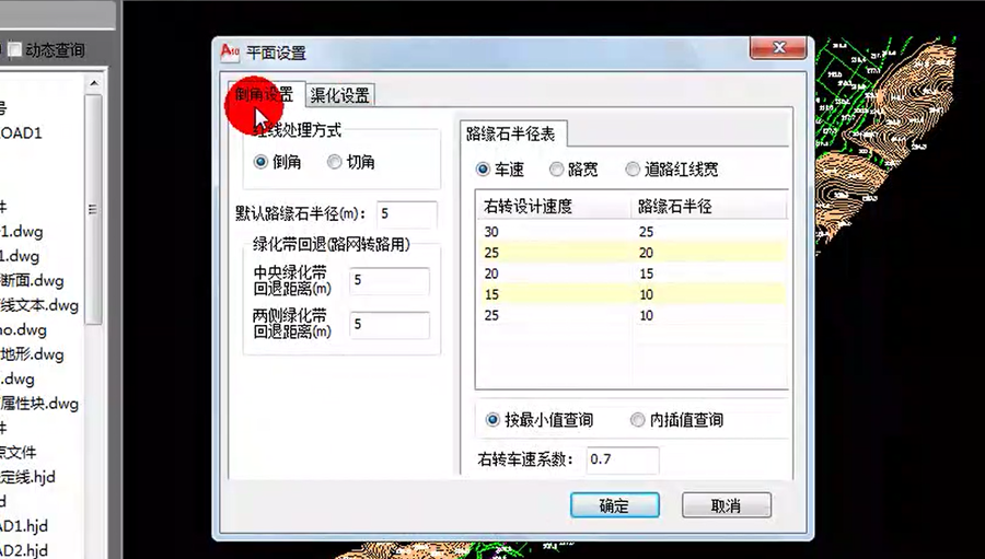 4)三種方式都可以按最小值查詢和內插值來查詢。默認的路緣石半徑“5m”,中央、兩側綠化帶回退距離“5m”。