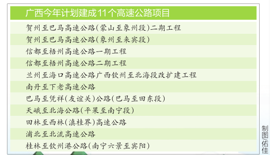據了解,今年全區在建高速公路建設項目共76個,建設里程約5569公里,總投資約8740億元;計劃新開工龍勝至峒中公路(龍勝至融安段)、天峨至北海公路(南寧至北海段)等29條高速公路共2000公里以上,計劃建成南丹至天峨(下老)公路、田林至西林(滇桂界)公路、梧州至信都公路二期工程等11個項目。