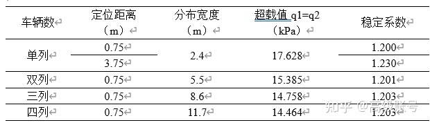 可見車輛數對穩定系數的影響不大,這與《路基路面工程》中“行車荷載對較高邊坡的穩定性較小”一致。而車輛分布在硬路肩外邊緣時較不利。故在后面的設計工作中,個人認為直接取公路I級單列或雙列都可以,定位距離取土路肩寬度較合適。因為會出現車輛停在硬路肩上的情況(這種情況對于穩定較不利)。