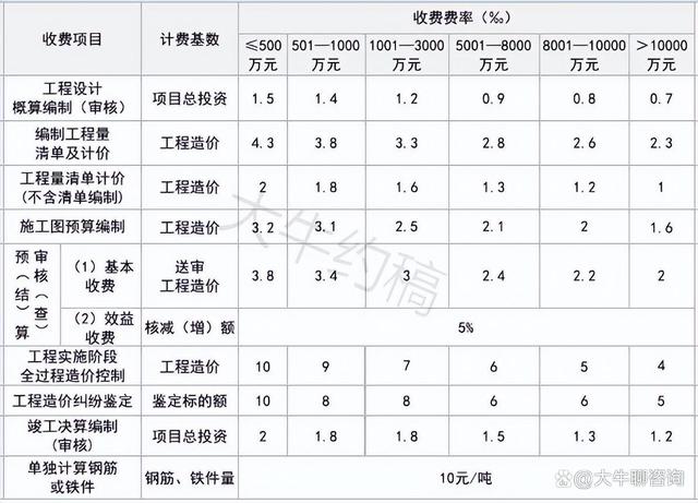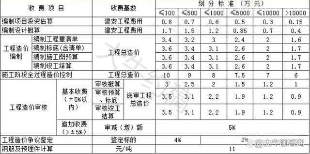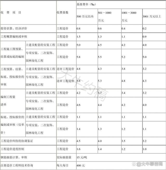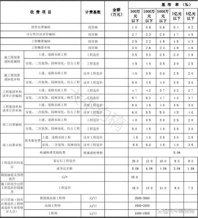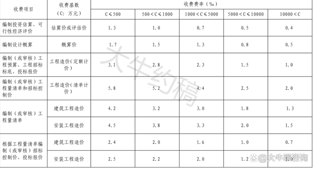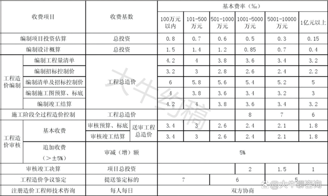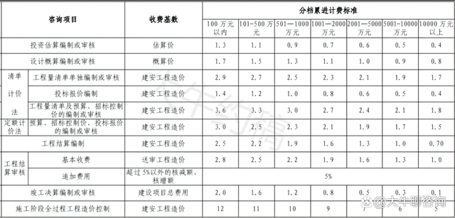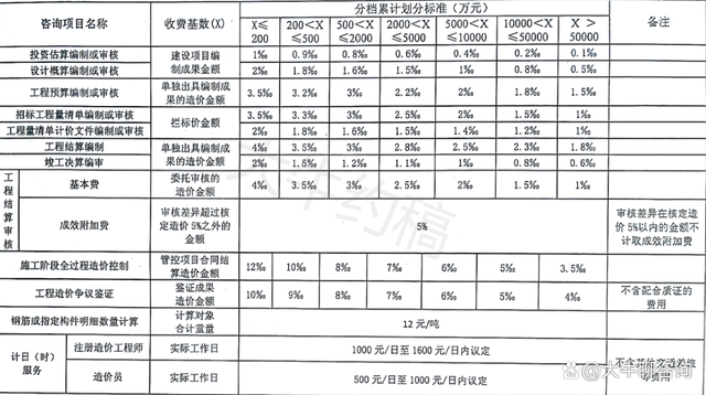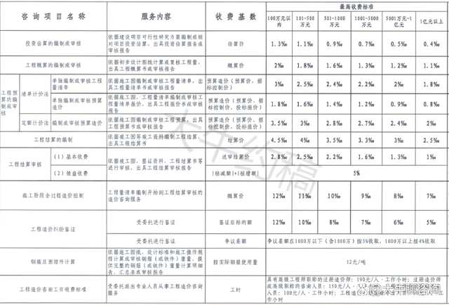4.工程造價咨詢服務收費按照本標準計算收費,低于每項3000元的按3000收取,超出3000元時按本標準收取;
