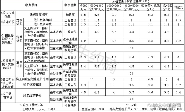 5、建設工程造價咨詢服務收費標準實行分檔累進計費方式。