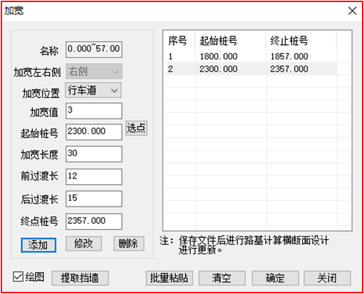 緯地軟件實(shí)現(xiàn)任意復(fù)雜線形設(shè)計(jì)3、批量設(shè)計(jì)錯(cuò)車(chē)道和斷面寬度變化針對(duì)低等級(jí)公路需要添加的錯(cuò)車(chē)道數(shù)量較多或者設(shè)置護(hù)欄時(shí)土路肩需要加寬的情況,緯地軟件增加了快速加寬設(shè)計(jì)功能。可根據(jù)加寬需求設(shè)置加寬名稱(chēng)、加寬位置(含行車(chē)道、硬路肩、土路肩)、加寬值、加寬起終點(diǎn)樁號(hào)、加寬長(zhǎng)度、過(guò)渡段長(zhǎng)度等參數(shù),也可直接提取該項(xiàng)目的擋墻設(shè)置段落進(jìn)行加寬設(shè)計(jì)。