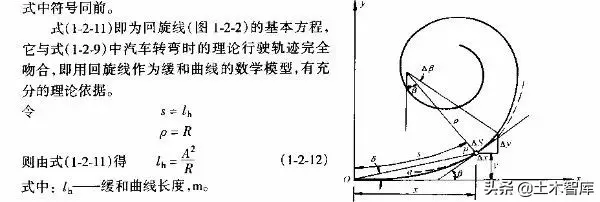 式(1-2-11)為汽車轉彎時的理論軌跡方程,從中可以得出兩個結論:—是該曲線上任一點的曲率半徑與該點至曲線起點距離成反比,它符合汽車在道路上的行駛軌跡;二是參數A對某一曲線來說,是一個常救,但就整個公路線形而言,其實質為一個放大倍數,它適應于不同的情況,因此,需建立一個數學模型來作為緩和曲線。