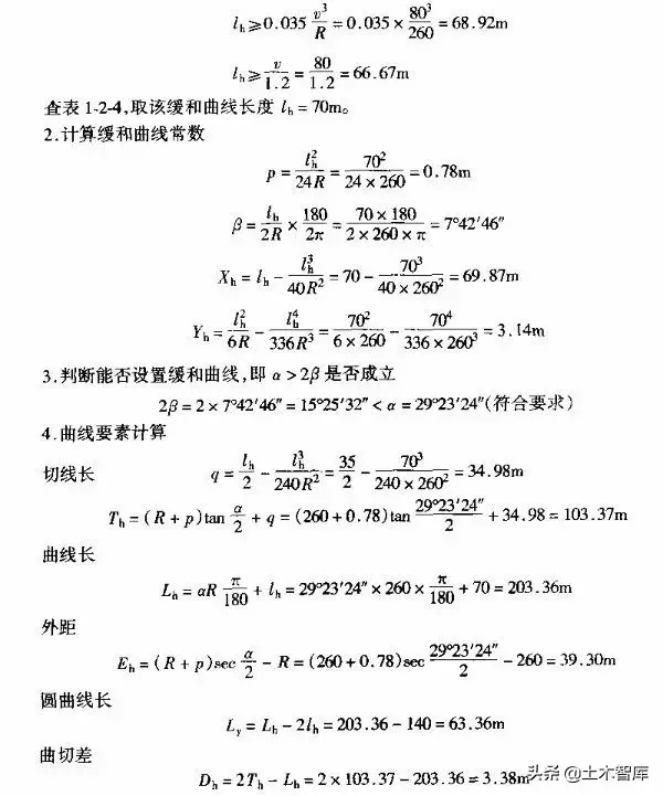 例1-2-4 某平原微丘區二級公路有一彎道,其平曲線半徑及R=260m,交點JD校號