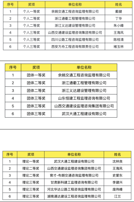 競(jìng)賽現(xiàn)場(chǎng)賽程緊湊,氣氛緊張,選手靈活運(yùn)用自己的經(jīng)驗(yàn)和技能,尋找現(xiàn)場(chǎng)存在的質(zhì)量安全問題。經(jīng)過一天的激烈角逐,裁判組綜合研判,評(píng)定出個(gè)人、團(tuán)體、理論獎(jiǎng)項(xiàng)如下圖,另有60名選手獲得優(yōu)勝獎(jiǎng),其中浙江選手包攬個(gè)人和團(tuán)體前三名。