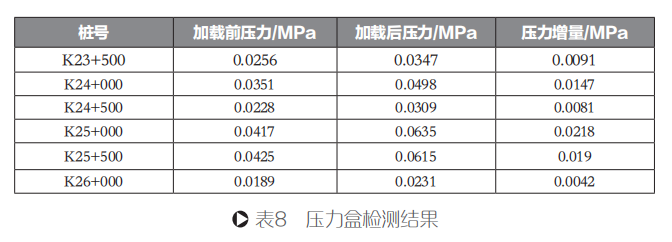 為測量長壽命瀝青路面試驗路段土基頂面所受壓力,根據《公路路基路面現場測試規程》(JTG E60-2008)要求,在試驗路行車道上埋置壓力盒,測取在10t軸載單輪下的壓力值,具體檢測結果如表8所示。