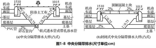 中央分隔帶的排水設(shè)施由排水溝(明溝、暗溝)、滲溝、雨水井、集水井、橫向排水管等組成。中央分隔帶可采用凸式(見圖1-8)、平式或凹式,一般不封閉,但也可封閉。