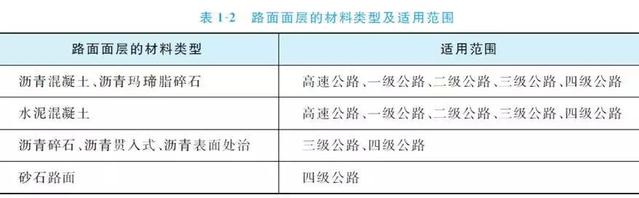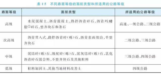 路面等級分為高級、次高級、中級和低級,不同路面等級的面層類型和所適用的公路等級見表1-5。