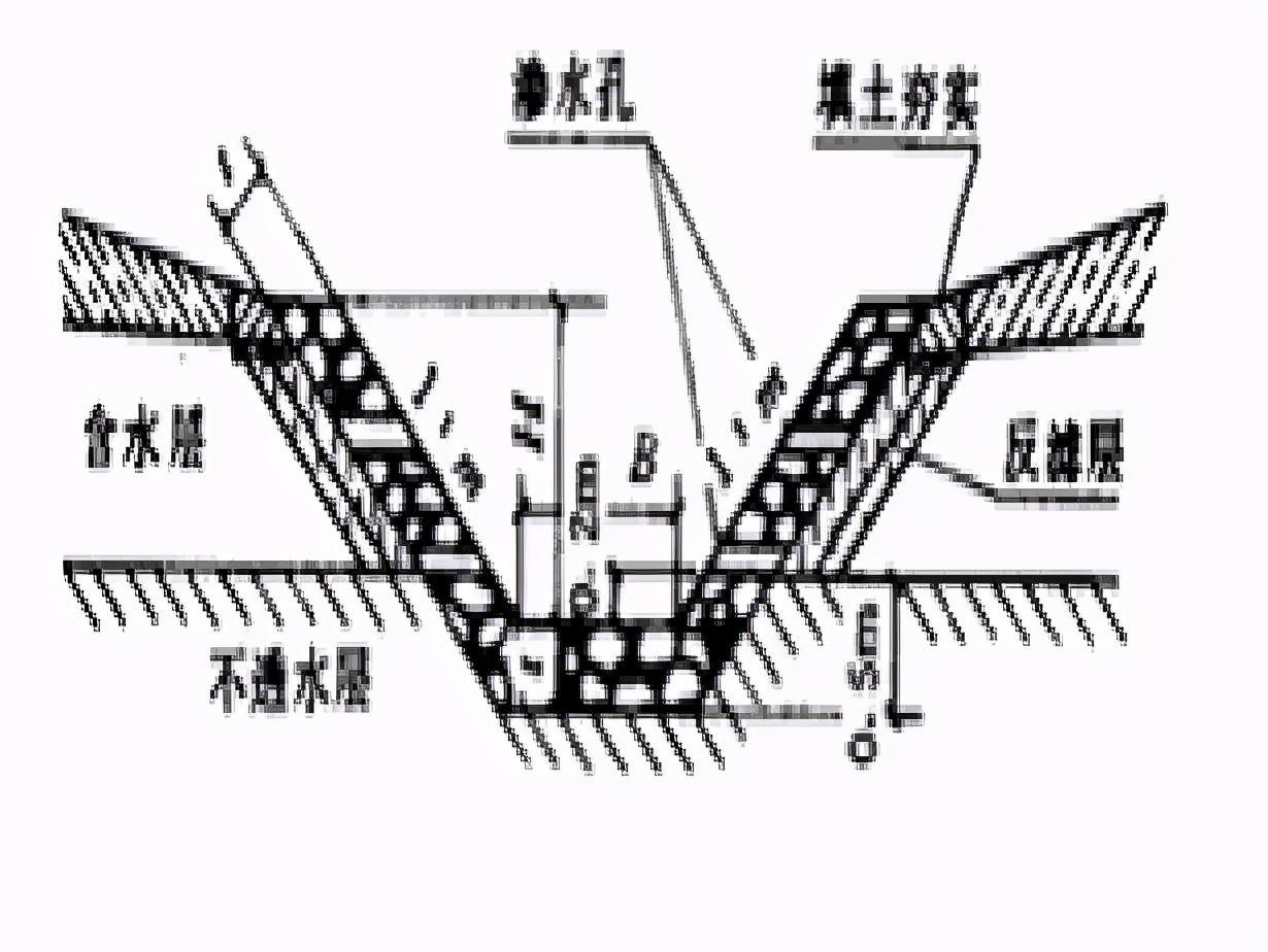 用于降低地下水位、排除地下水的滲溝又稱平式滲溝,包括埋置深度2-6m的淺埋滲溝;按照有無滲水管可分為有管滲溝和無管滲溝;同時(shí)起支撐邊坡作用的滲溝稱為邊坡滲溝。
