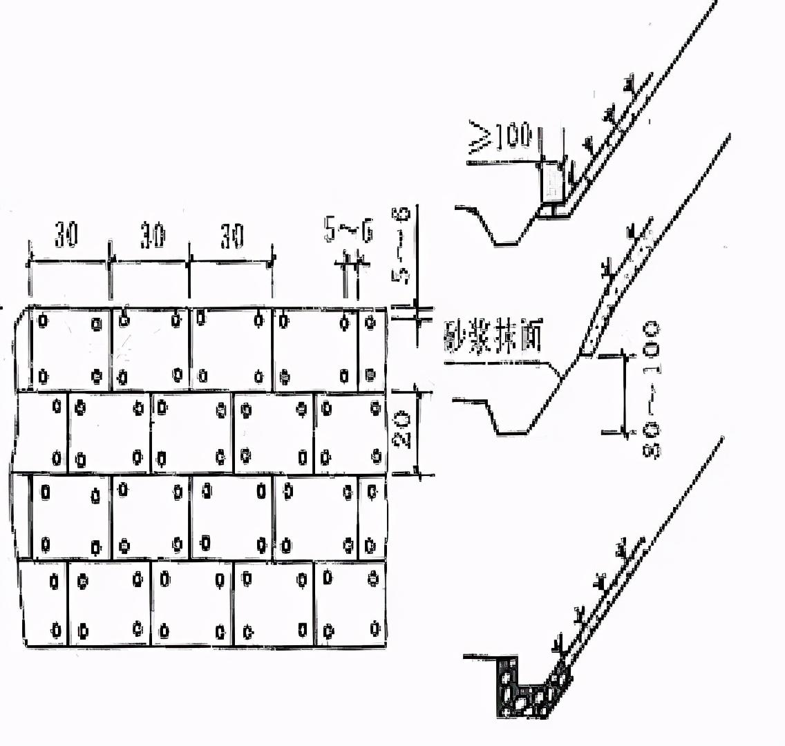 • 坡面防護(hù)措施:用于防護(hù)開挖邊坡坡面的巖石風(fēng)化剝落、碎落及少量落石等現(xiàn)象。如砂漿抹面、噴漿、片石護(hù)墻、錨桿噴漿等。