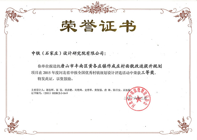 該項目于2015年12月榮獲由河北小城鎮(zhèn)規(guī)劃建設(shè)協(xié)會頒發(fā)的規(guī)劃三等獎。