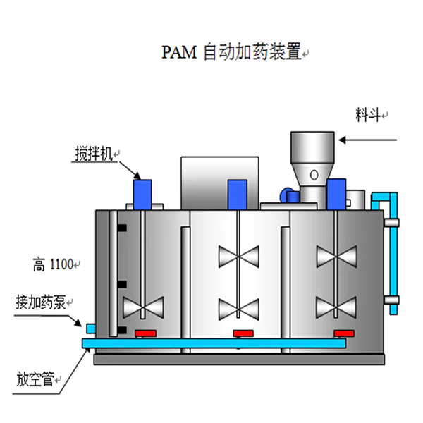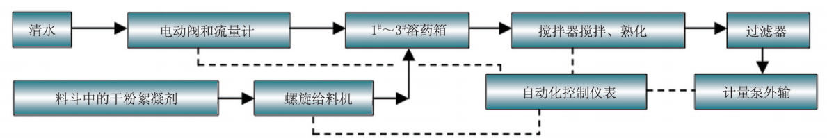 在污水處理系統(tǒng)中,為了除去或降低水中懸浮物,使其產(chǎn)生大顆粒的凝聚體,加快水中雜質(zhì)和污泥沉降速度,一般在污水處理的沉降部分加入一定濃度的絮凝劑。用于含油污水處理的絮凝劑包括無機絮凝劑、有機絮凝劑和復(fù)合絮凝劑 3 大類。為了保證加藥濃度、減輕工人勞動強度和降低藥劑成本,應(yīng)用絮凝劑自動加藥工藝技術(shù)。
