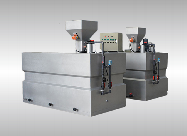 裝置工作原理:干粉絮凝劑加入干粉料斗后,按設(shè)定的配比濃度,由螺桿給料機定量輸入溶解箱內(nèi),與定量的清水混合,經(jīng)過攪拌器攪拌、熟化后,由計量泵將混合液外輸至加藥點 。