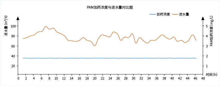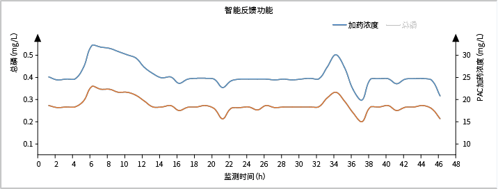 消除由于進(jìn)水不穩(wěn)定造成的出水 SS 波動,削峰效果明顯,使出水 SS 穩(wěn)定達(dá)標(biāo),而且在進(jìn)水 SS 較低時,可以自動降低藥劑投加量或者間斷性加藥,極大地節(jié)省藥劑投加量。智能加藥系統(tǒng)穩(wěn)定可靠、精準(zhǔn)控制,為用戶降低管理成本及提升經(jīng)濟效益,具有廣闊的應(yīng)用前景。