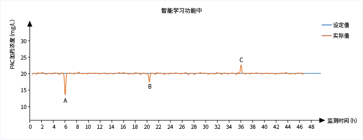 智能學(xué)習(xí)功能可根據(jù)歷史加藥數(shù)據(jù)自動學(xué)習(xí),糾正當(dāng)下的加藥偏差,達(dá)到加藥精準(zhǔn)穩(wěn)定。即使出現(xiàn)人為誤操作,加藥實際值發(fā)生偏差,通過智能學(xué)習(xí)程序系統(tǒng)會自動修正實際加藥量,恢復(fù)到設(shè)定的加藥量。