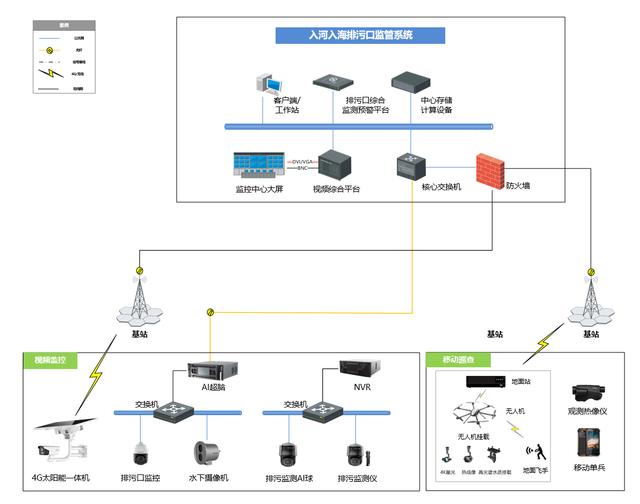 對排污口排放的受納水體采用排污監(jiān)測儀進行水質在線監(jiān)測。通過 4 G 太陽能攝像機、水下攝像機等設備全天候實時監(jiān)測排污口排污狀況,發(fā)現(xiàn)違規(guī)事件及時告警。通過無人機對河道情況進行立體化巡查,并可搭載高光譜水質掛載,實現(xiàn)河道水質指標反演。通過 單兵 、觀測熱像儀等設備 , 進行排口移動巡查、取證記錄 。